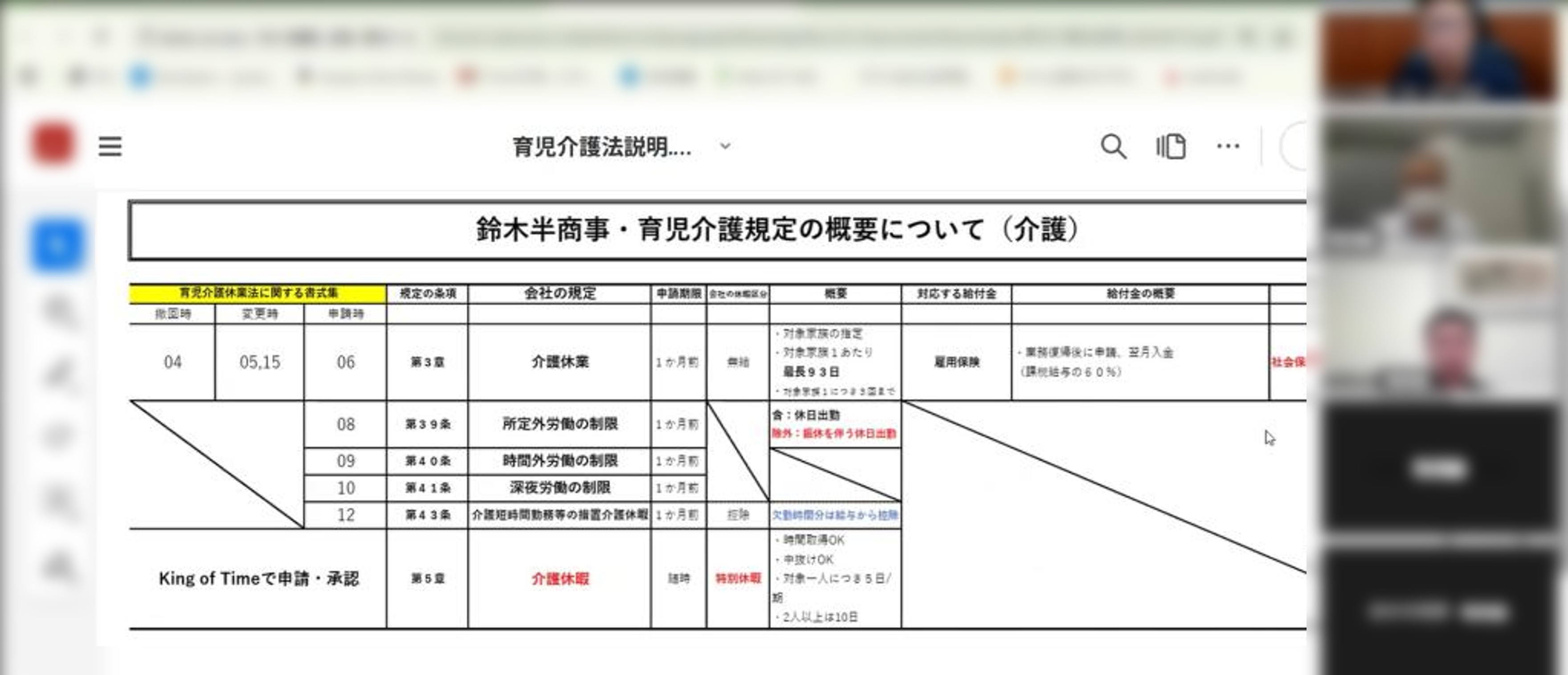 10月6日に実施した「育児(休業法)にかかる規定」に引き続き、今回は「介護(休業)法にかかる規定」の説明会を実施しました。